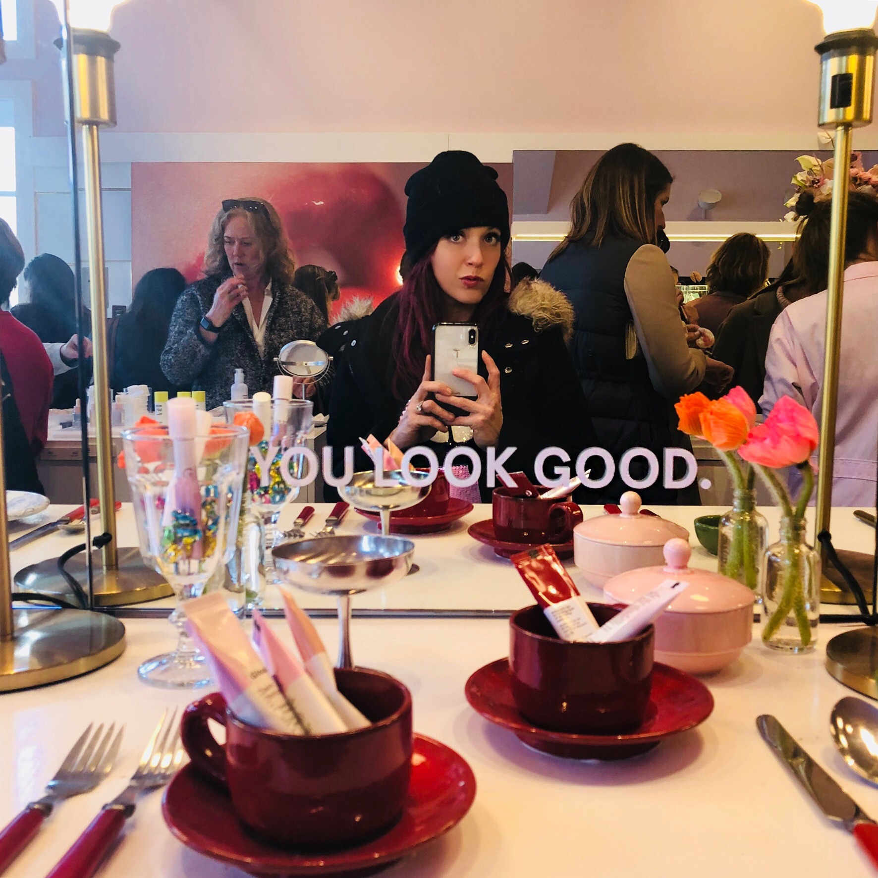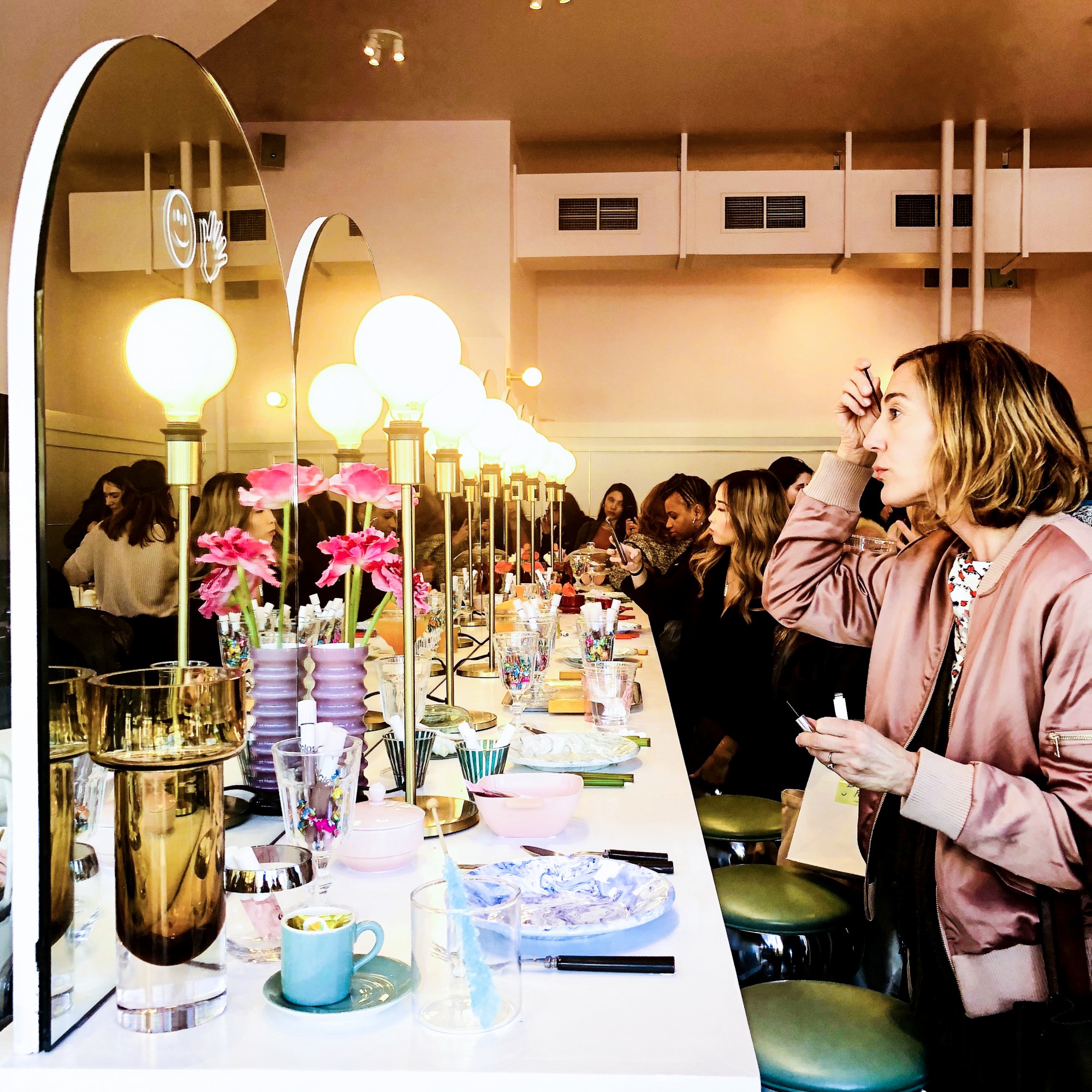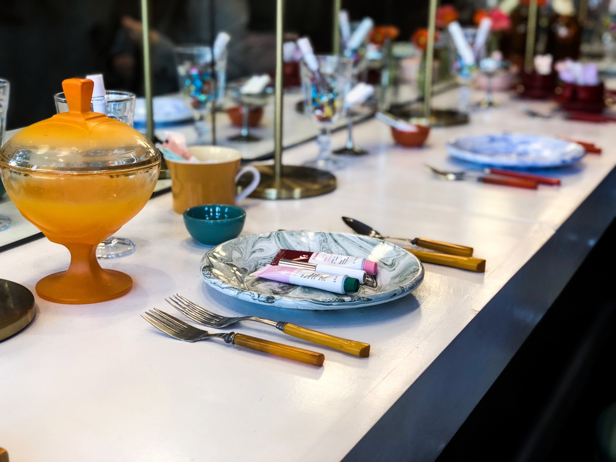 Not only was the place designed to let everyone play with the products on their faces—it was set up for photos too. All along the counter were products interspersed with diner-y elements—like glasses, plates and platters. Because photos of your beauty products are part of the fun.