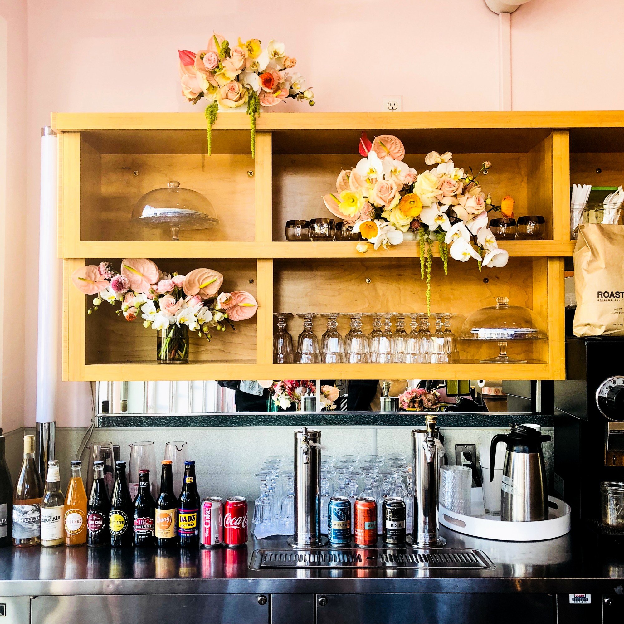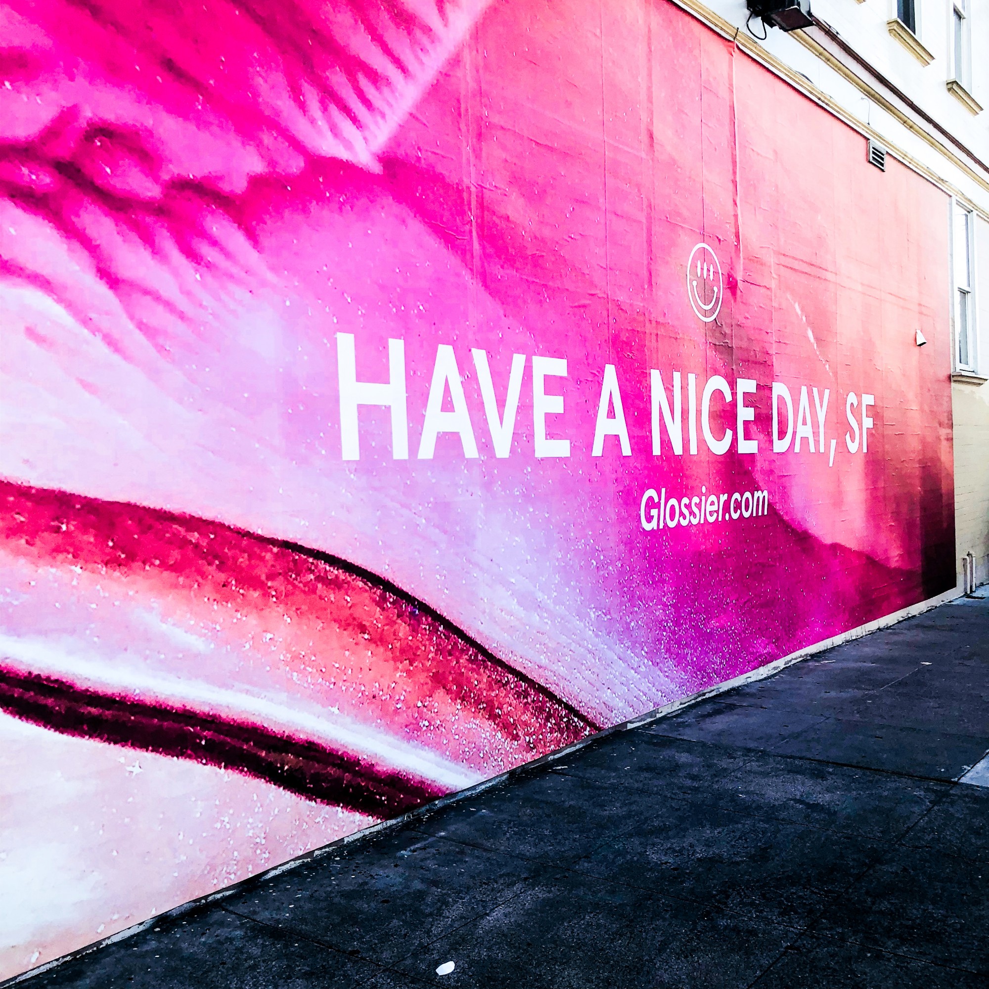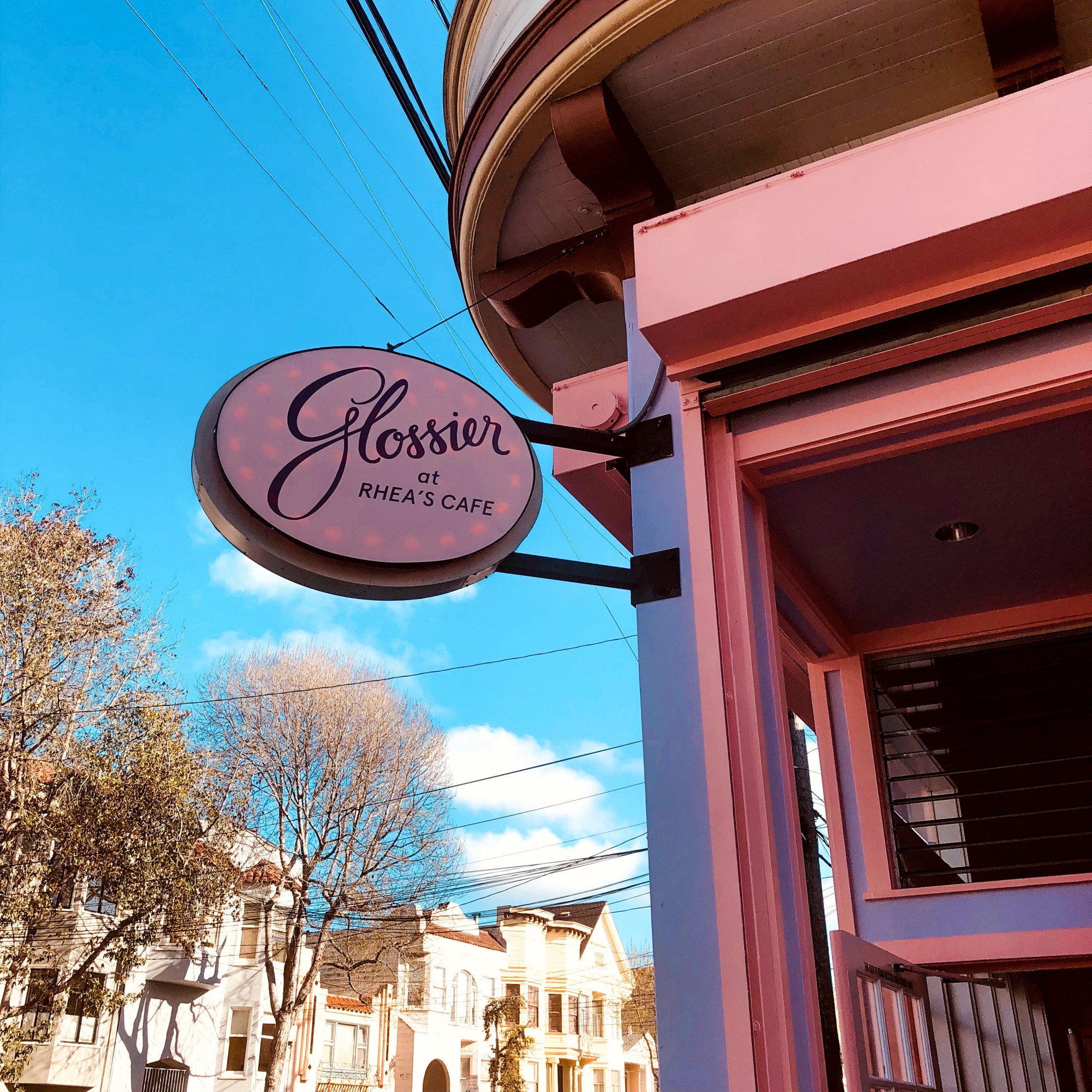 Rhea’s Cafe sits in a hip area of the Mission. Once Glossier took it over for the month, the front entrance was transformed—complete with pink and purple painted exteriors, a sign that looked retro-modern and giant Insta-magnet outdoor wall that read “Have a Nice Day, SF.”