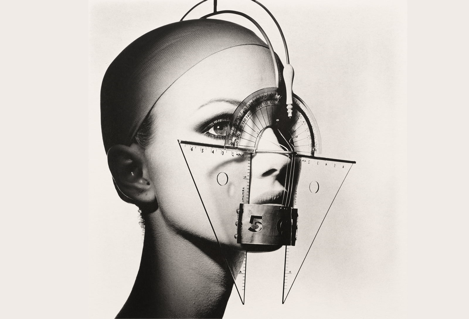 Penn’s images are timeless no doubt, but they are also more than simply beautiful imagery. There are Surrealist elements, with comparisons drawn to the work of Man Ray. “Protractor Face (Jaime Rishar)” is a black-and-white study of facial geometry, symmetry, and proportion. It also comments on the pursuit of numerical perfection.