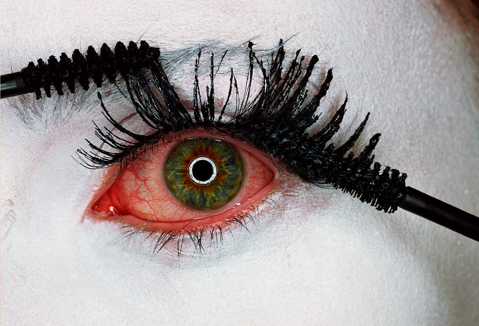 “Bee on Lips” is a humorous take on bee-stung lips, placing the insect on a vibrant mandarin orange mouth. A minimalist image with maximum impact, somewhere between the sweetness of honey and the threat of the sting. “Mascara Wars” depicts a white-powdered face with spidery black lashes and an extremely bloodshot eye as mascara is being applied: a commentary on the pain of beauty, on the interplay between the artificial representation with the fallible flesh.