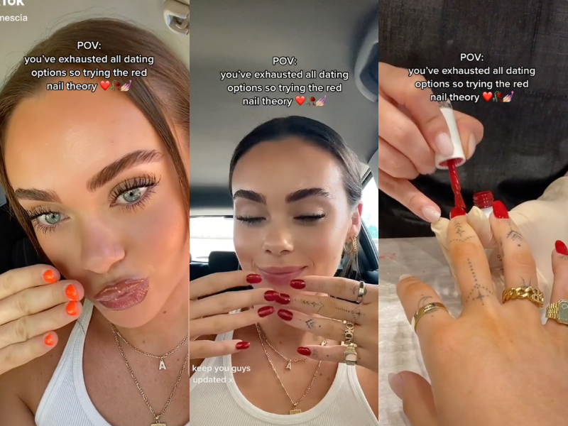 A trend that originated from TikToker @GirlBossTown, AKA Robyn DelMonte, the red nail theory is the idea that wearing a red manicure attracts male attention. According to DelMonte, whenever she sports a red nail look, several men pay her more attention, and she gets asked on multiple dates. The user believes the reason behind this is because when a lot of Gen Z and millennial men were growing up in the late '90s and early '00s, their mothers would have red manicured nails. "I weirdly think guys are attracted to red nails because it reminded them of their moms when they were growing up and taking care of them," she says in the video.
