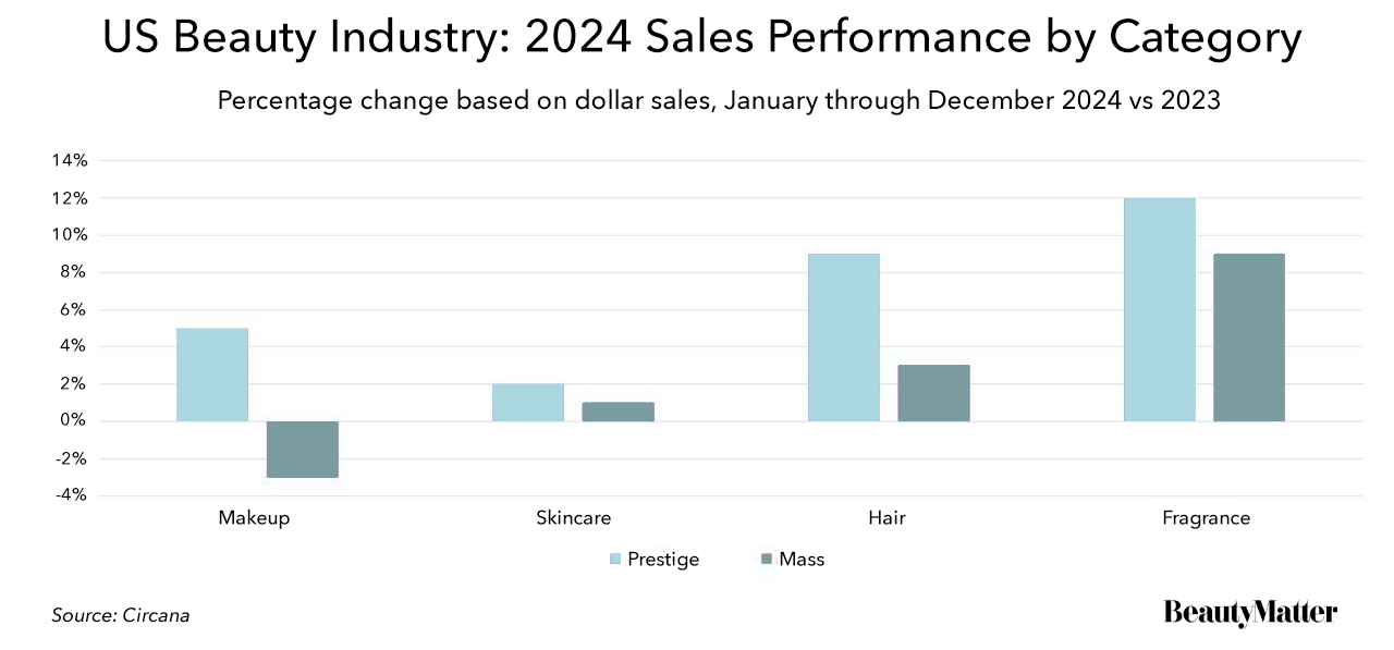 US beauty industry sales grew for the fourth consecutive year across mass and prestige, according to Circana’s year-end data. The prestige, which includes department and beauty specialty retailers, is up 7%, hitting $33.9 billion, while mass showed 3% growth. Fragrance was the breakout category across both prestige and mass, growing the fastest and becoming the second-largest prestige beauty category for the first time.