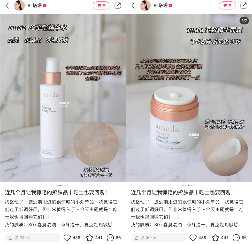 Amala Beauty, a luxury natural skincare brand from Germany, is one of the niche brands that do product seeding on Little Red Book. The high-end brand chose to work with a selected cohort of KOCs and KOLs to boost word-of-mouth and product awareness in the China market. Amala Beauty's KOL-sponsored posts align with consumer demand for both "organic" and "anti-aging" products. In addition, the headline focuses on the needs of different segmented or brand positioning, such as "high end" and "niche."