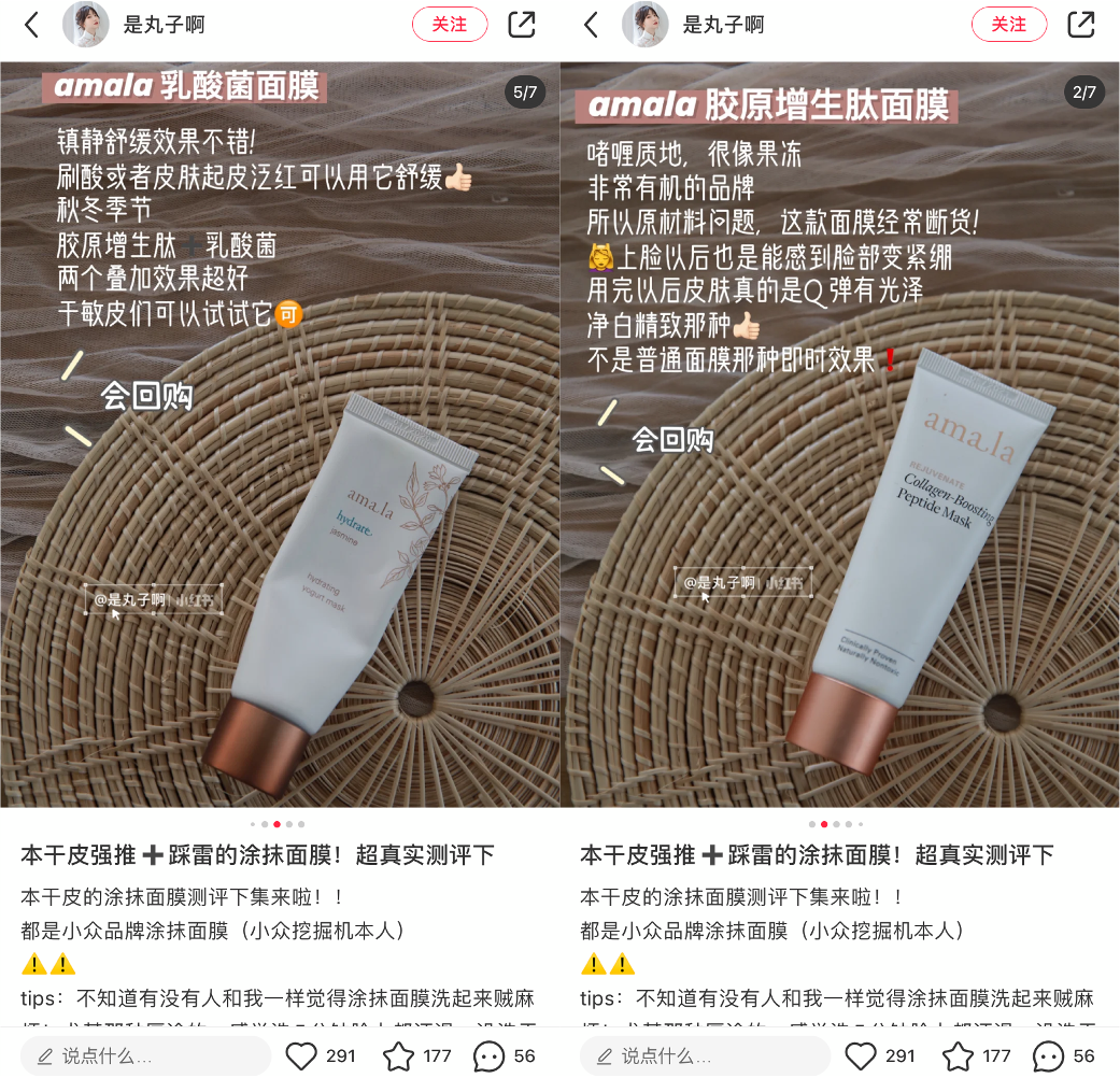 Amala collaborated with a few top KOLs (>500K followers) on Little Red Book to quickly boost brand buzz. For example, @zujolee (@猪小角, @是丸子啊) featured Amala products in their reviews and skincare sharing notes a few months before the Double 11 campaign last year. In addition, they published exclusive posts for Amala during or before the promotion week. These posts garnered a significant number of favorites, likes, and comments in a short time. Meanwhile, KOLs' sharing has inspired ordinary users to buy the products and share personal reviews, adding long-lasting values to Amala’s online presence.