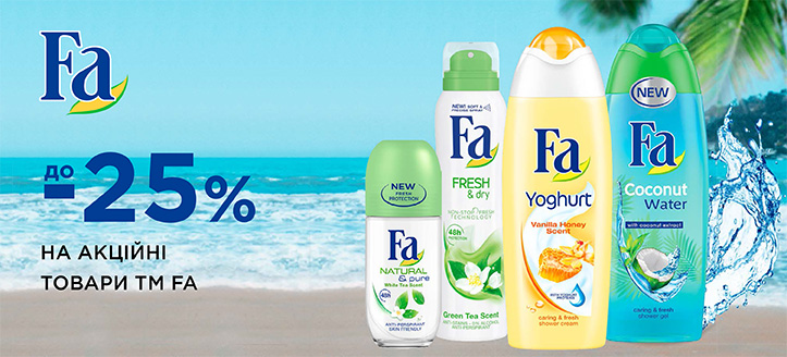Акція від ТМ Fa 09 березня 2017 Знижка до 25% на акційні товари ТМ Fa*при наявності акційного товару**ціни на сайті вказані з урахуванням знижки Акція скінчилась 23 березня 2017